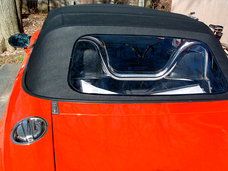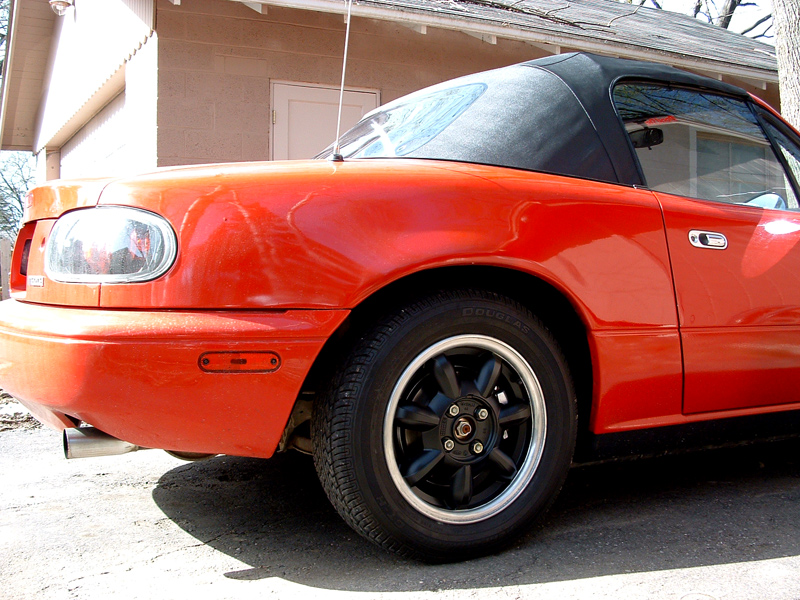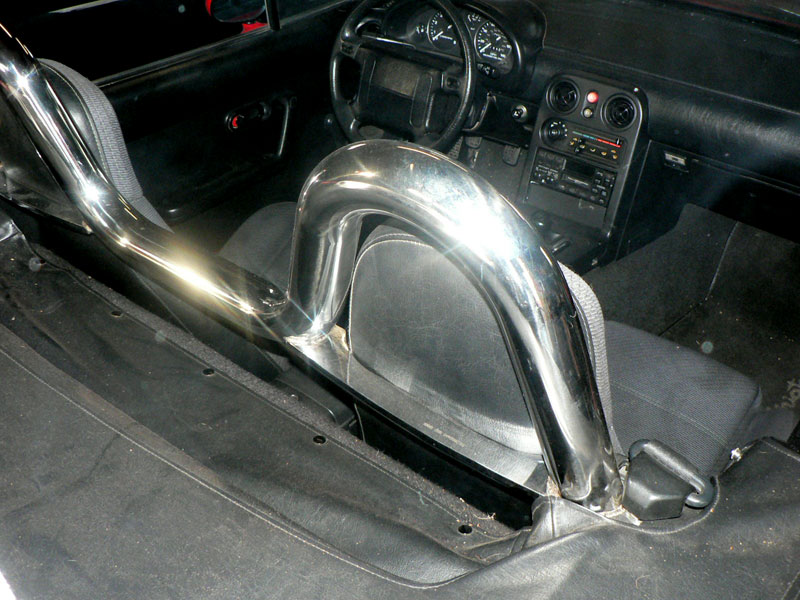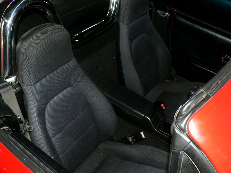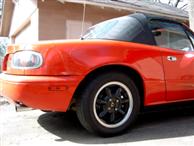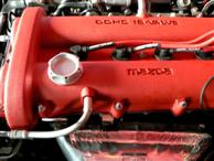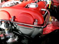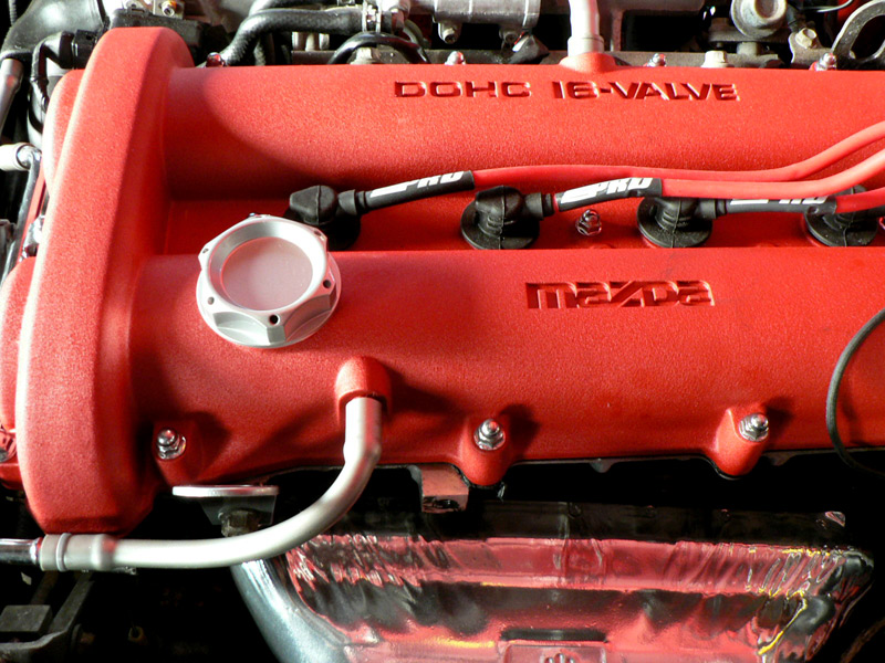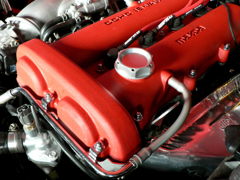 Aesthetics / Interior: Red low-wrinkle powdercoated valve cover Misc. Silver powdercoated pieces Ceramic coated exhaust heat shield HKS oil filler cap (powdercoated) Racing Beat style bar Hose Techniques silver silicone vacuum lines Painted/Polished Factory wheels Silver painted calipers No zip cabrio top BSP Classic Fuel Lid Euro-Black taillights PRD "frankenstein" smooth bolt kit PRD SS top rail bolt kit |